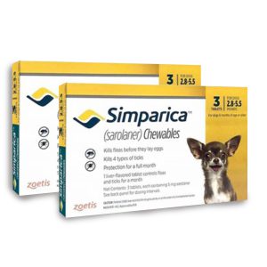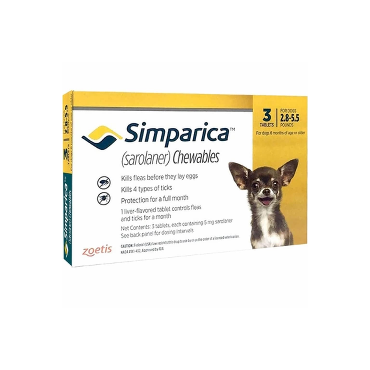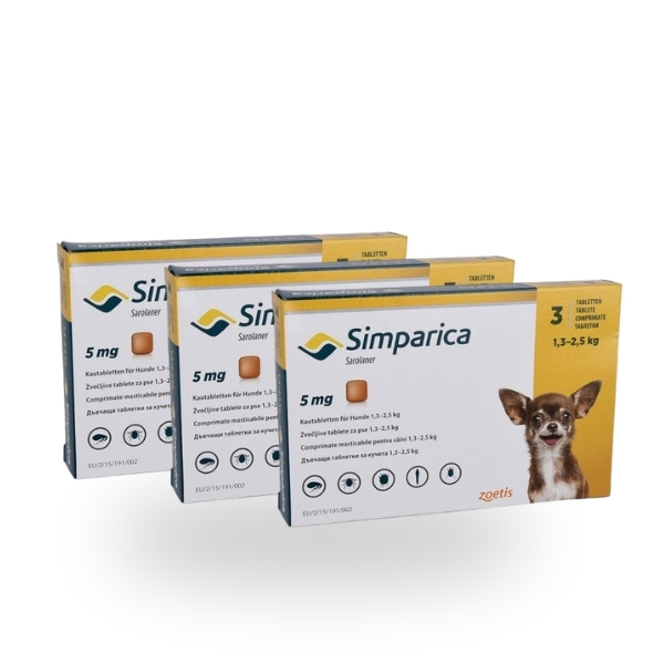 שלישייה סימפריקה 5 מ"ג לכלבים במשקל 1.3-2.5 ק"ג (תוקף 11/26)